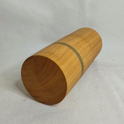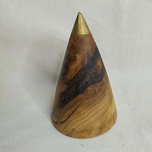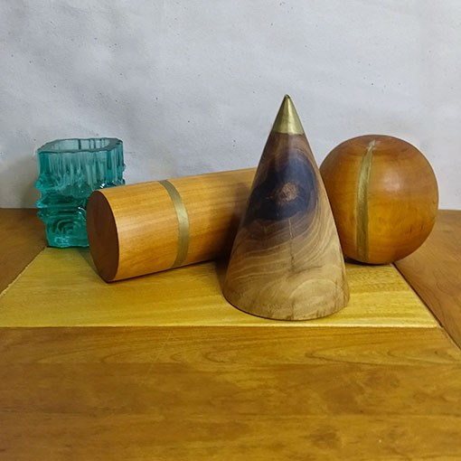 Male drvene skulpture osnovnih geometriskih oblika Lopta Valjak Kupa. Svakom komadu dodata je aplikacija od zlatnih listića , da istakne lepu strukturu drveta .